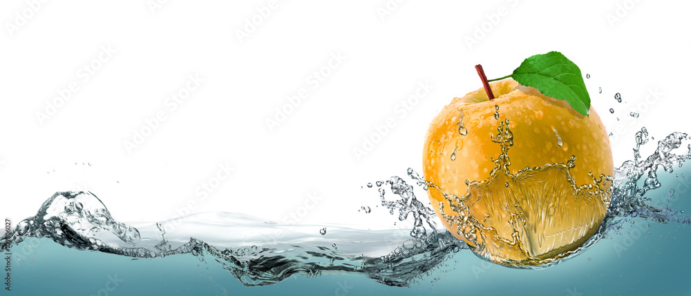Obraz na plátně Yellow, juicy apple as a card on the water background.