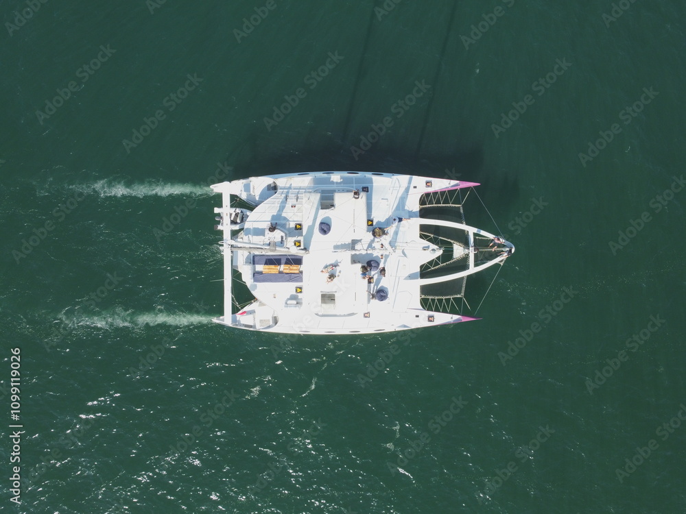 Obraz na plátně A modern trimaran sailboat on the water under a partly cloudy sky