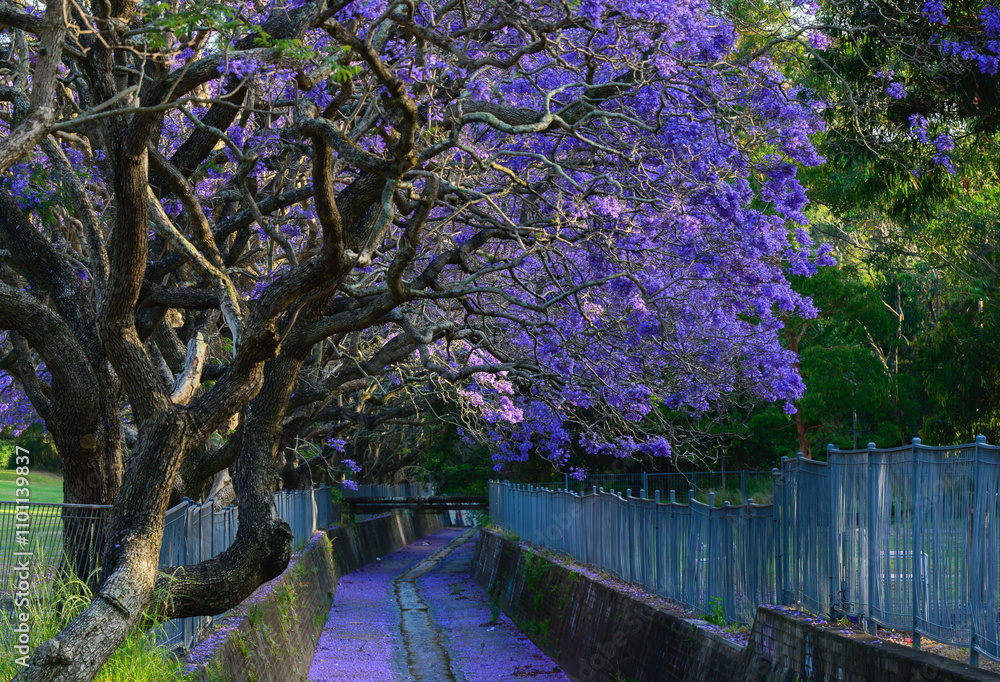 Obraz na plátně The photo was taken on the streets of Sydney, featuring blooming jacarandas