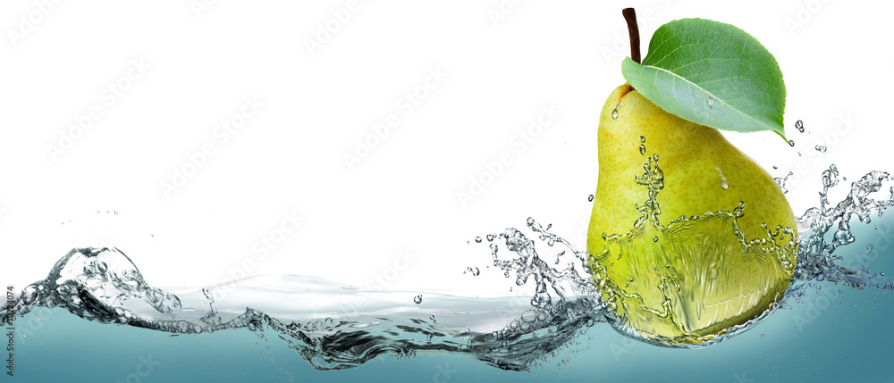 Obraz na plátně The fruit of a ripe pear on a background of splashing water.