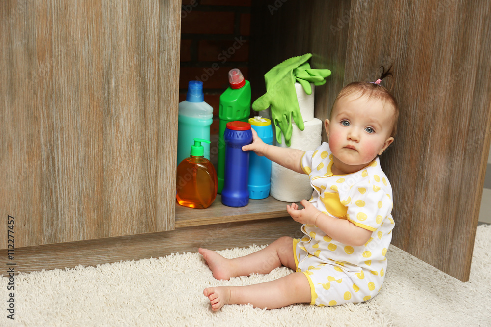 Obraz na plátně Little girl playing with detergents in kitchen