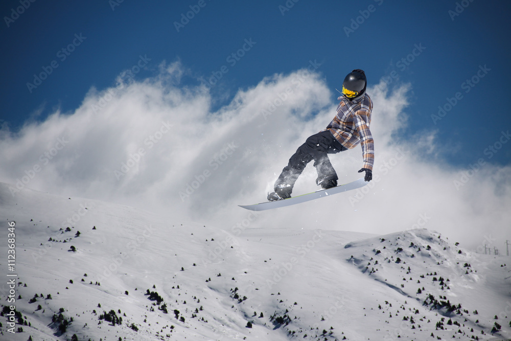 Snowboard rider jumping on mountains. Extreme snowboard freeride sport.