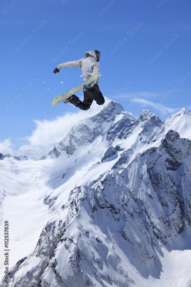 Snowboard rider jumping on mountains. Extreme snowboard freeride sport.