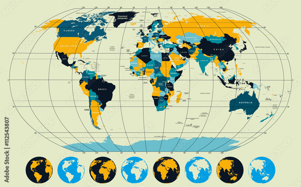 Obraz na plátně High detailed, world map with meridians and parallels
