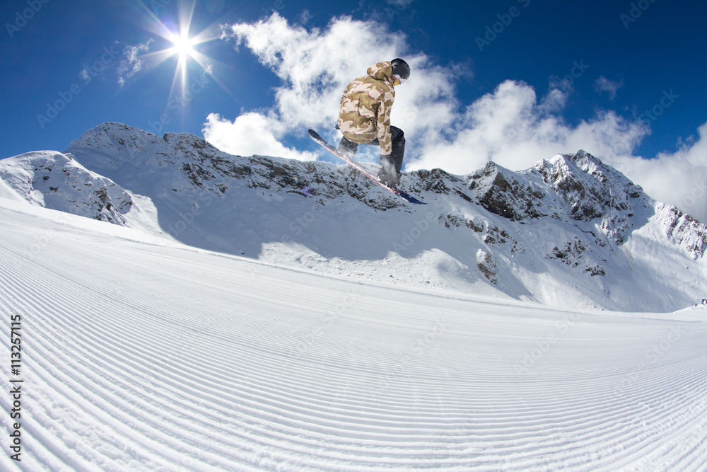 Snowboard rider jumping on mountains. Extreme freeride sport.