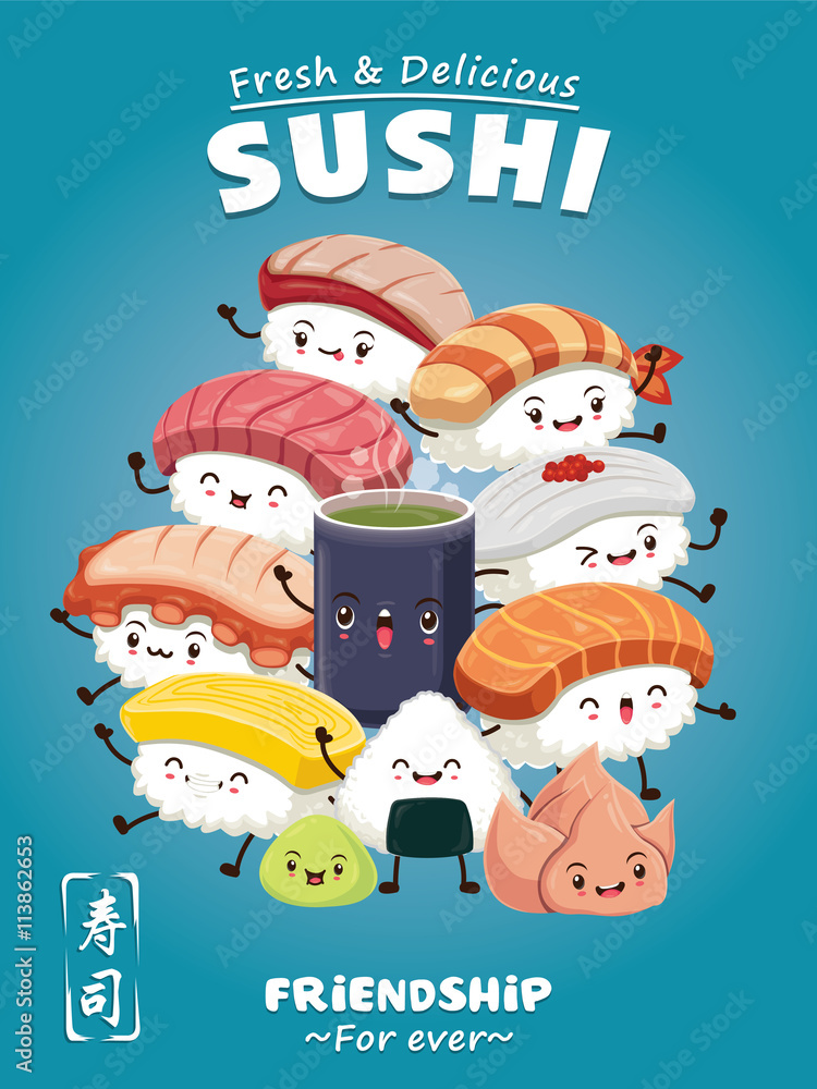 Obraz na plátně Vintage Sushi poster design with vector sushi character