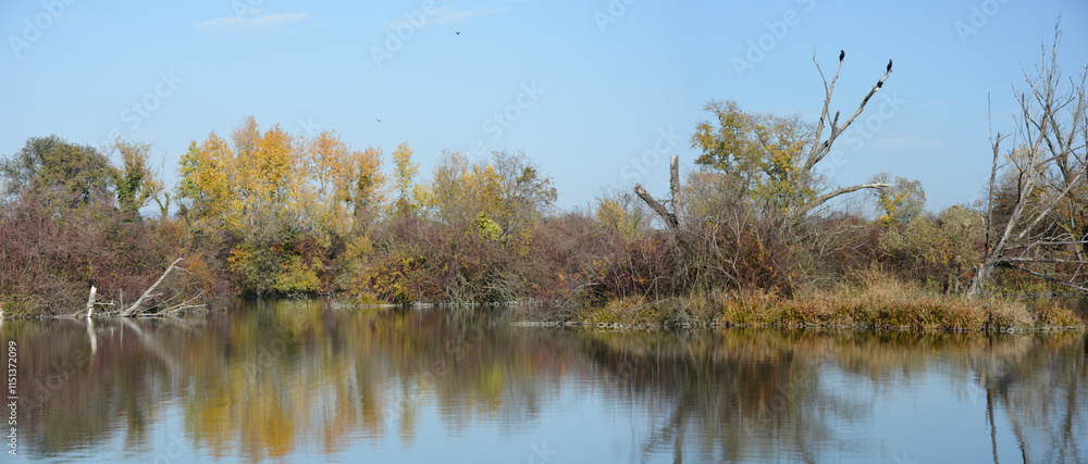 Obraz na plátně Several cormorants perch on the bare branches of a dead tree in a wetland enviro