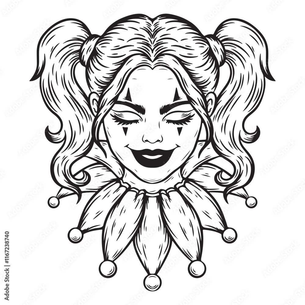 Obraz na plátně illustration art black and white pigtail clown girl in engraving style tattoo an