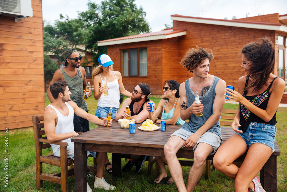 Obraz na plátně Happy young people drinking beer and having outdoor summer party