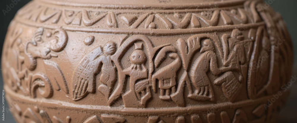 Obraz na plátně A clay pot featuring intricate carvings depicting ancient figures and symbols