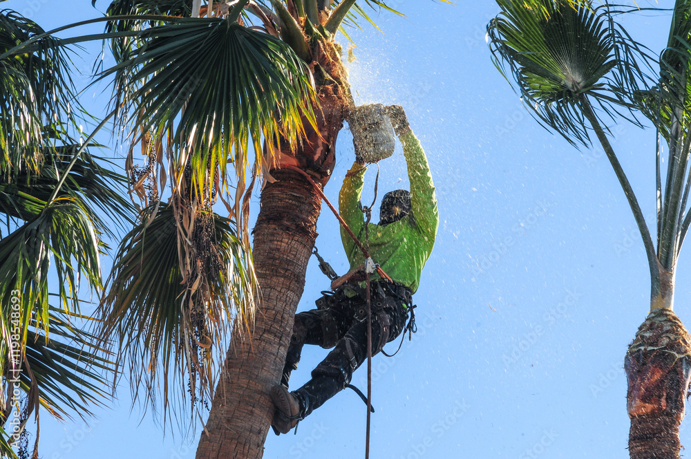 Obraz na plátně Arborist in safety gear trimming a tall palm tree, surrounded by falling debris