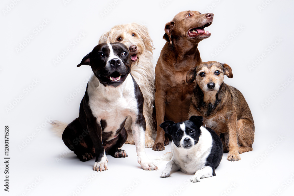 Obraz na plátně Group of dogs in white background posing in studio