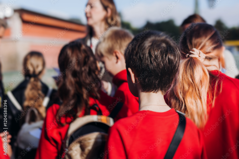 Obraz na plátně Group of school pupils and students on outdoor excursion tour in the city street
