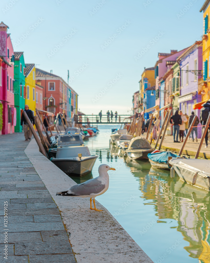 Obraz na plátně Seagull and canalside in Burano, Venice Lagoon