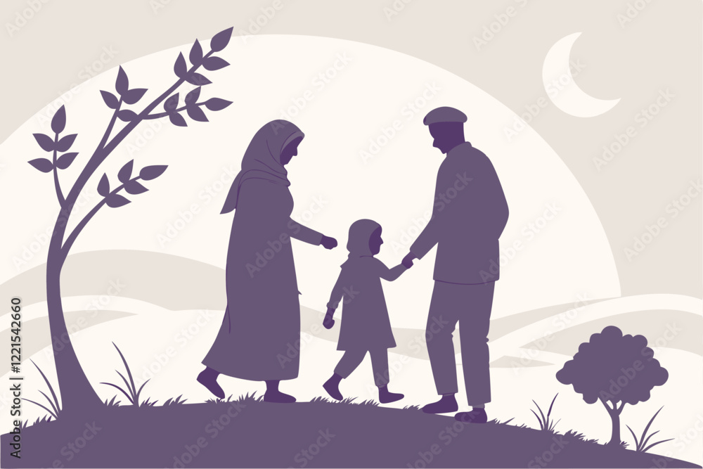Obraz na plátně Silhouette of a Muslim Family Walking Outdoors at Dusk