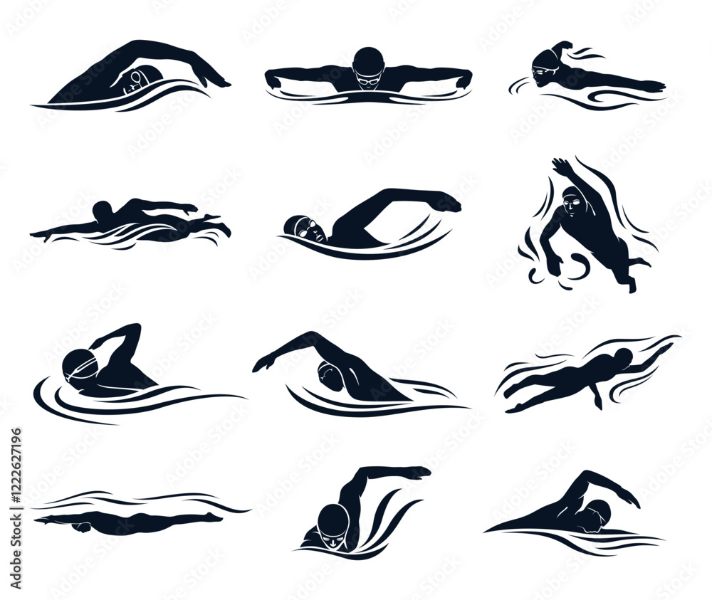 Obraz na plátně Swimmer male athlete silhouette swimming in water waves icon set vector flat ill