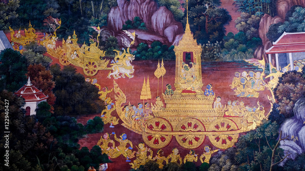 Obraz na plátně Masterpiece of traditional Thai style painting art old (1931) of Ramayana story on the temple wall of famous Wat Phra Kaew in Bangkok, Thailand