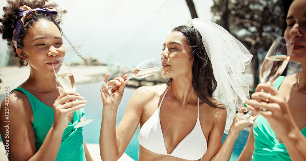 Obraz na plátně Drinking, champagne and bridal shower with women at pool for hotel, celebration and holiday