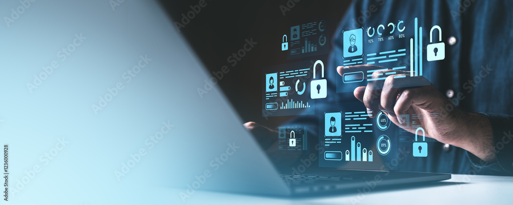 Obraz na plátně Digital security concept with a man interacting with holographic locks and data icons on a laptop screen