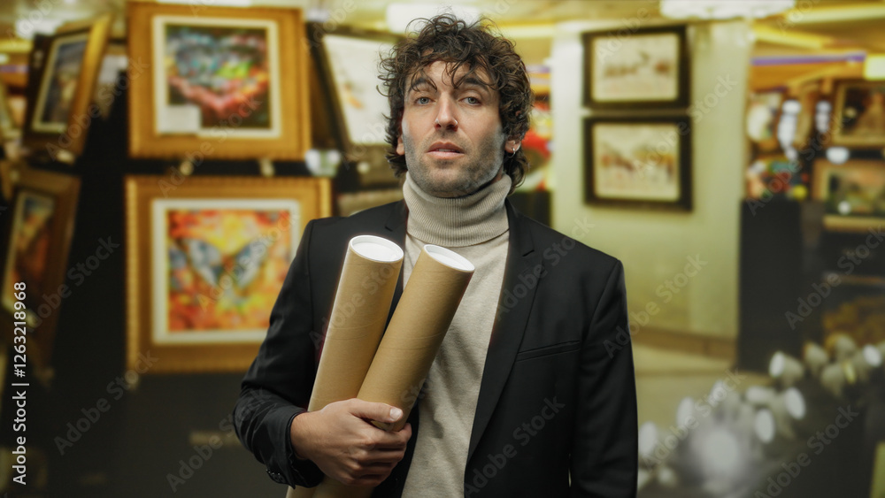 Obraz na plátně Young hispanic man holding art tubes stands confidently in an indoor gallery surrounded by colorful framed art pieces, showcasing an elegant and artistic environment