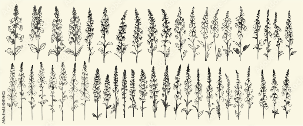 Obraz na plátně Hand-drawn foxglove flowers in black line art for rustic wedding designs, trendy greenery, feminine botanical branch, modern decor, wedding herbs, floral accents, rustic chic