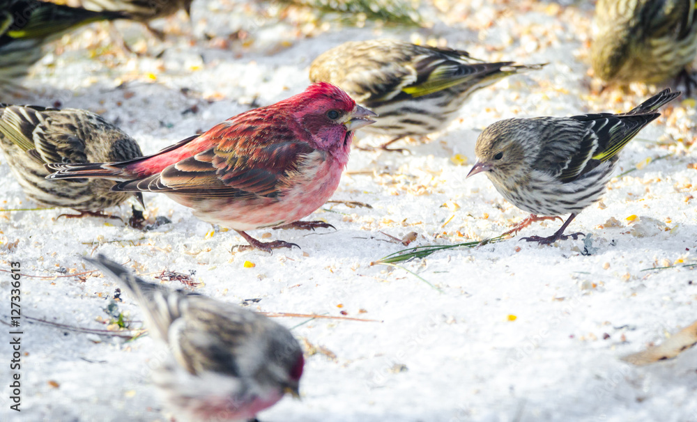 Obraz na plátně Purple Finches (Haemorhous purpureus) and other birds of spring competing for space and food at a feeder in a woodland area of Eastern Ontario, Canada
