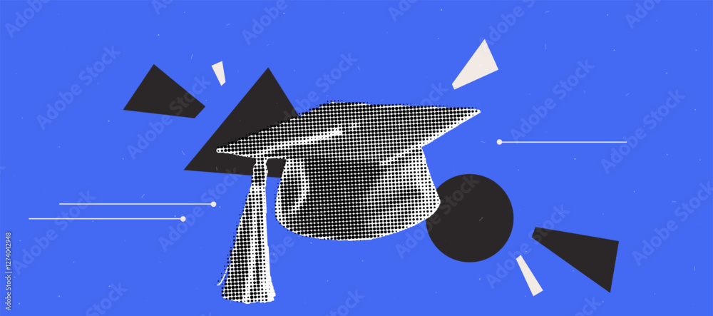 Obraz na plátně Graduation cap illustration with geometric shapes in halftone style for trendy d