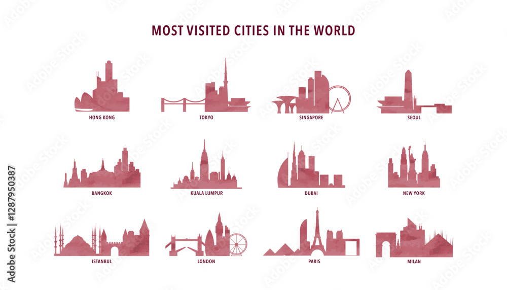 Obraz na plátně Most visited cities - watercolor logo, icon pack with skylines of Istanbul, Tokyo, Dubai, London, Paris, Hong Kong, Bangkok, New York, Singapore, Kuala Lumpur, Seoul, Milan