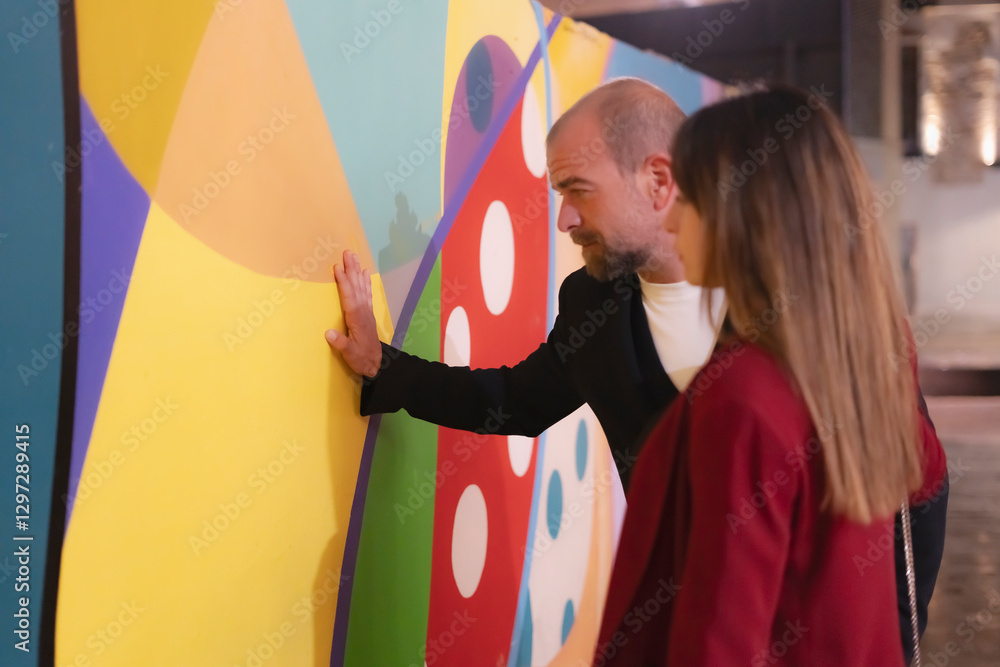 Obraz na plátně Art curator showing colorful modern painting to potential buyer
