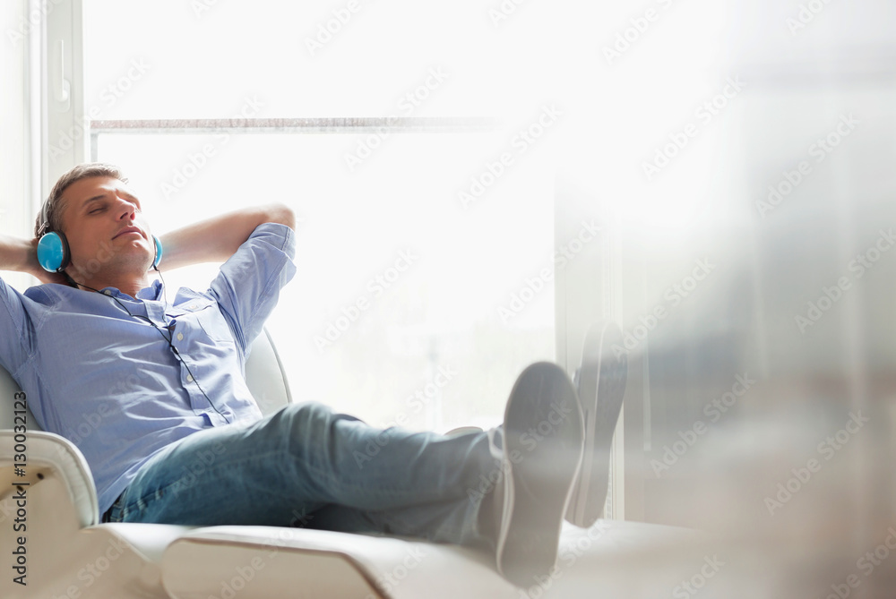 Obraz na plátně Full-length of relaxed Middle-aged man listening to music at home
