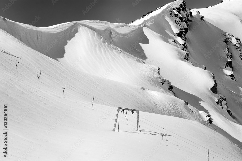 Obraz na plátně Black and white view on old surface lift and mountains with snow