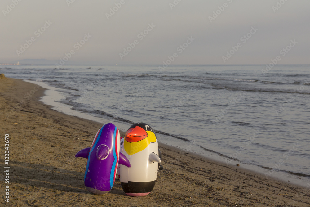 Obraz na plátně Aufblasbare Pinguine am Strand beim Plaudern