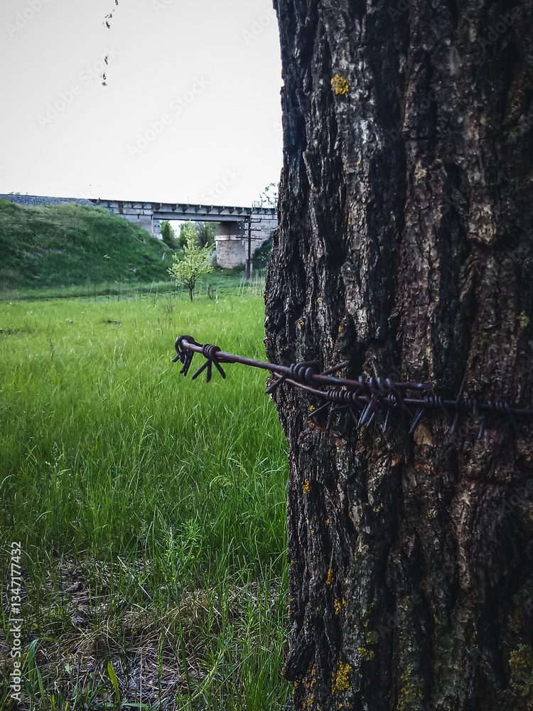 Obraz na plátně Close-up of a tree with barbed wire embedded in its bark against a green meadow and bridge