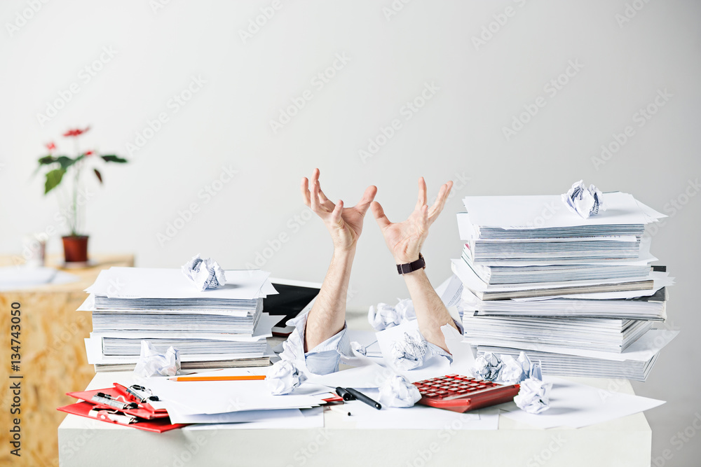Obraz na plátně The many crumpled papers on desk of stressed male workplace