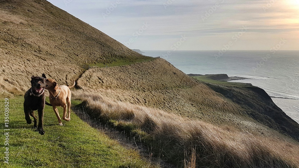 Obraz na plátně Dogs running along hillside with sea and sky in background