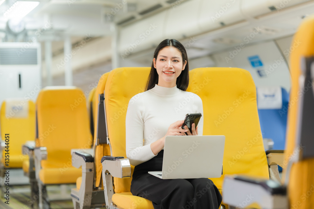Obraz na plátně Business Travel: A professional, Asian woman works comfortably on a laptop in a