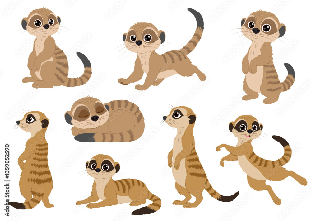 Obraz na plátně Seven cartoon meerkats in various poses suitable for childrens books, educational materials, and wildlifethemed designs
