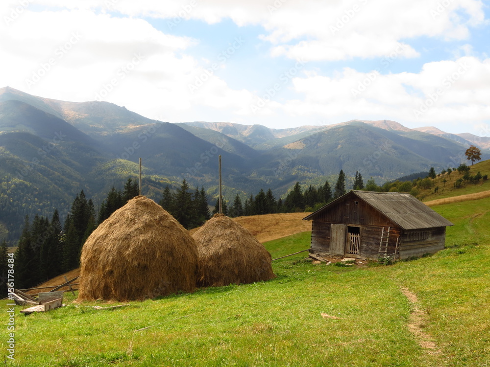 Obraz na plátně Old wooden hut and haystacks on background of beautiful mountain landscape and clouds