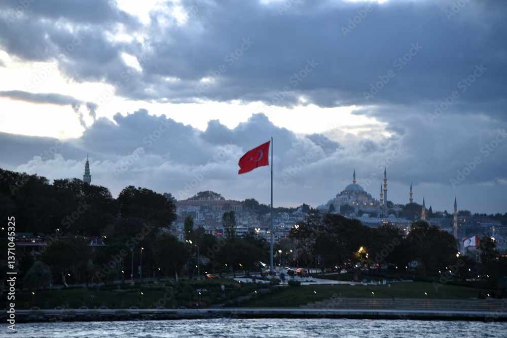 Obraz na plátně Istanbul Türkiye with flag viewed from the sea