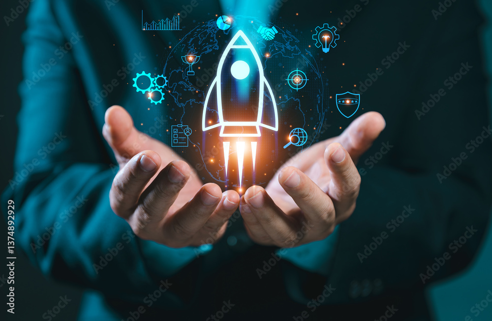 Obraz na plátně Startup business concept: a rocket is launching into space, just like for growing businesses and fast business success
