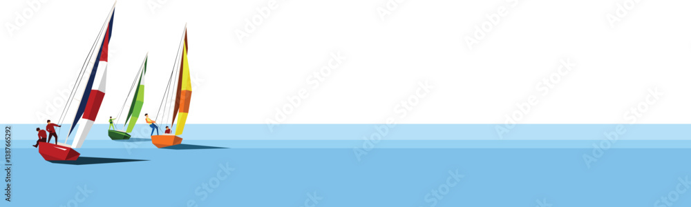 Obraz na plátně Colorful sailboats with people sailing on a calm sea in a flat minimalist vector style