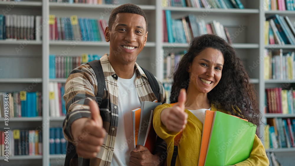 Obraz na plátně Happy African American man Hispanic Arabian Latino woman students library univer