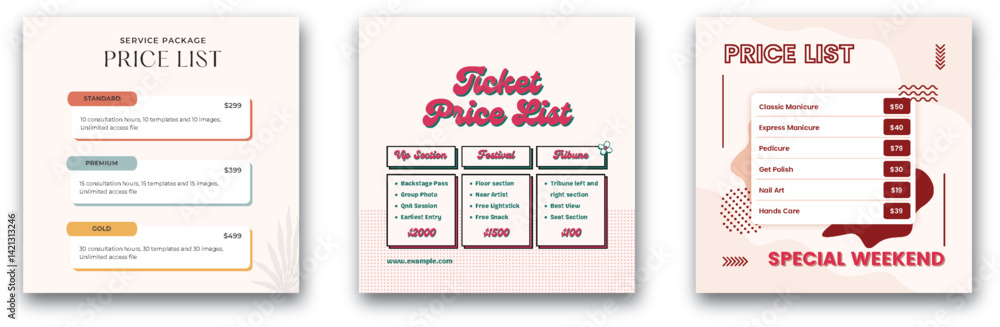 Obraz na plátně Price Lists: Photography, Concert Tickets, and Manicure Services