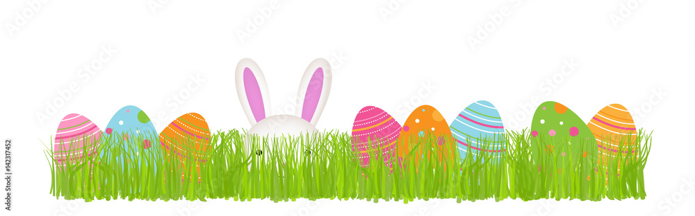 Obraz na plátně Easter Theme Banner – Rabbit and Eggs in Grass