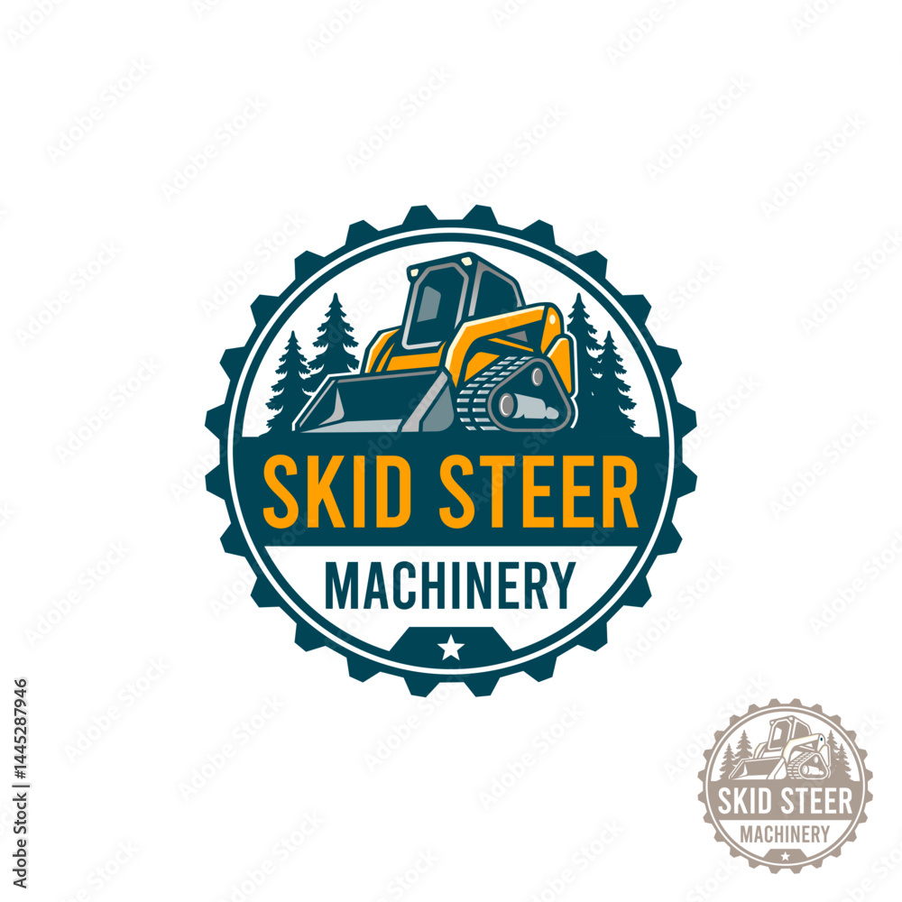 Obraz na plátně The logo features a bold, stylized circular background framing an illustration of a skid steer machinery and pine trees element for a strong identity
