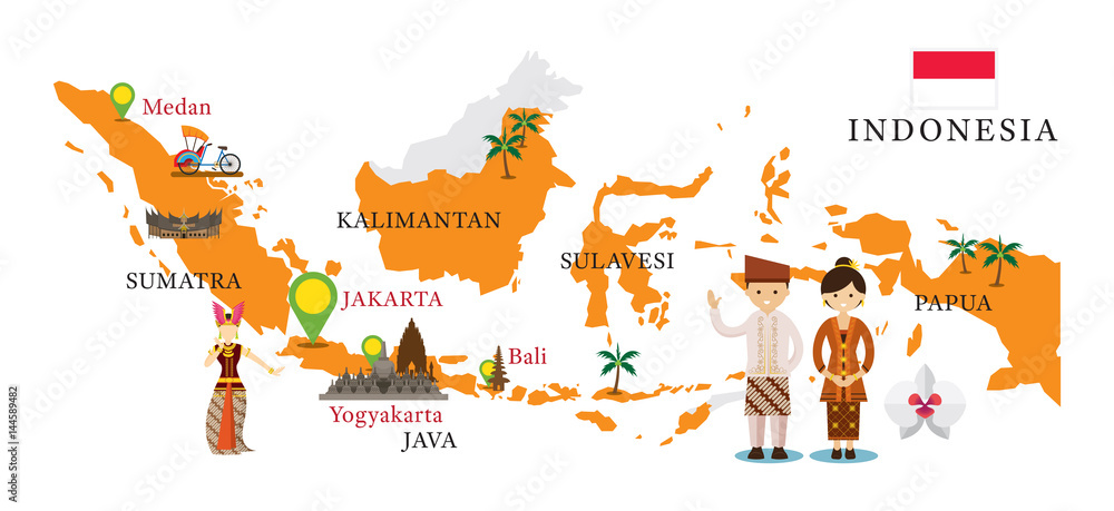 Obraz na plátně Indonesia Map and Landmarks with People in Traditional Clothing, Culture, Travel