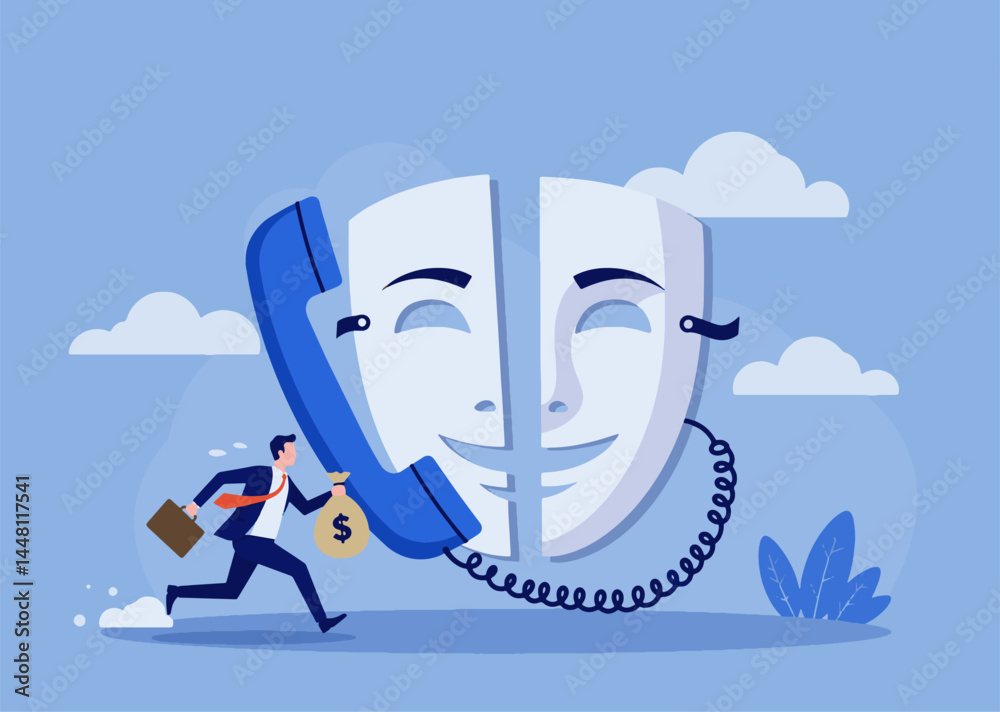 Obraz na plátně illustration of a masked businessman running with a money bag while holding a phone, symbolizing financial fraud, scam calls, and deceptive business practices, set against a blue background