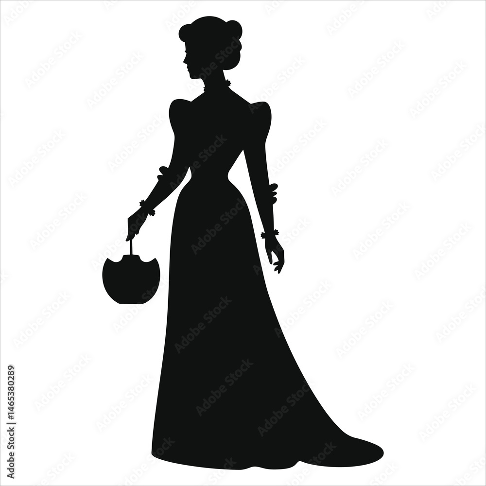 Obraz na plátně Elegant Vector Silhouette of a Woman in Edwardian Dress/A striking silhouette of a woman in a classic Edwardian-era gown