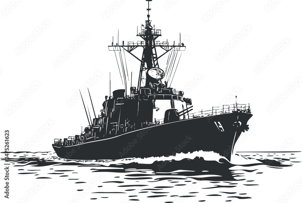 Obraz na plátně Black and white illustration of a naval warship moving through ocean water with