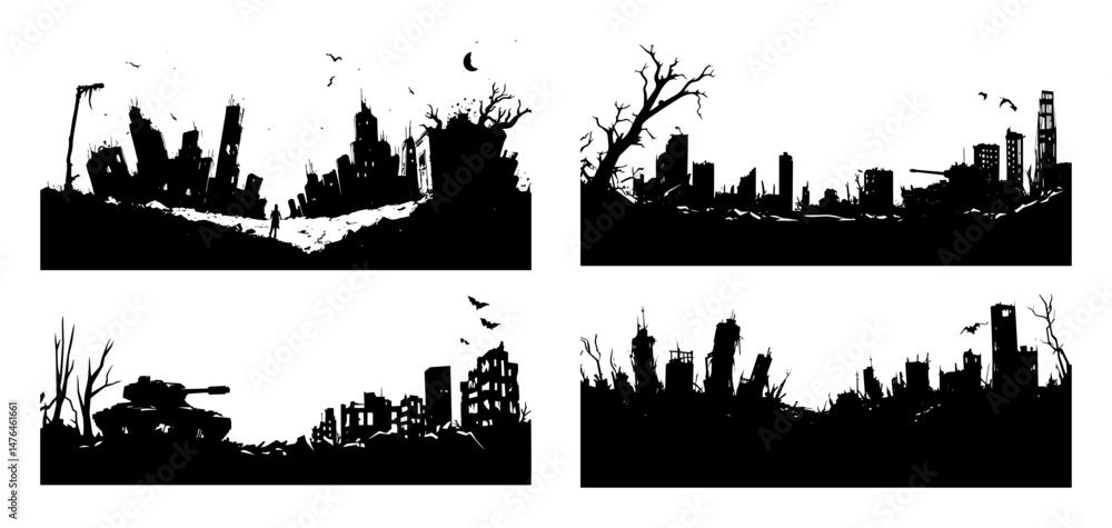 Obraz na plátně set of ruined cityscapes in post-apocalyptic style silhouette vector shape